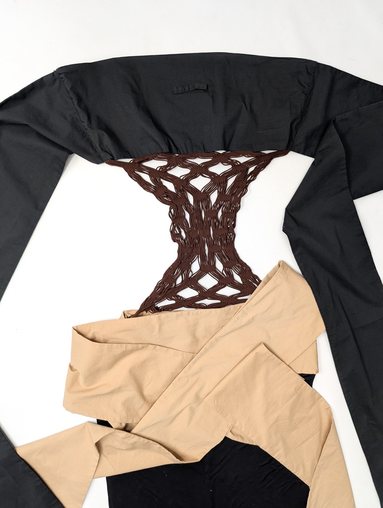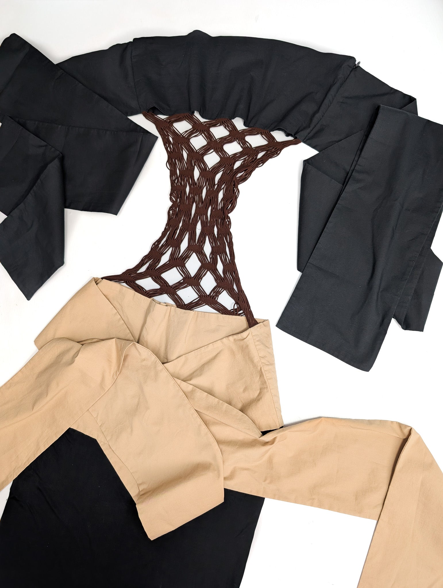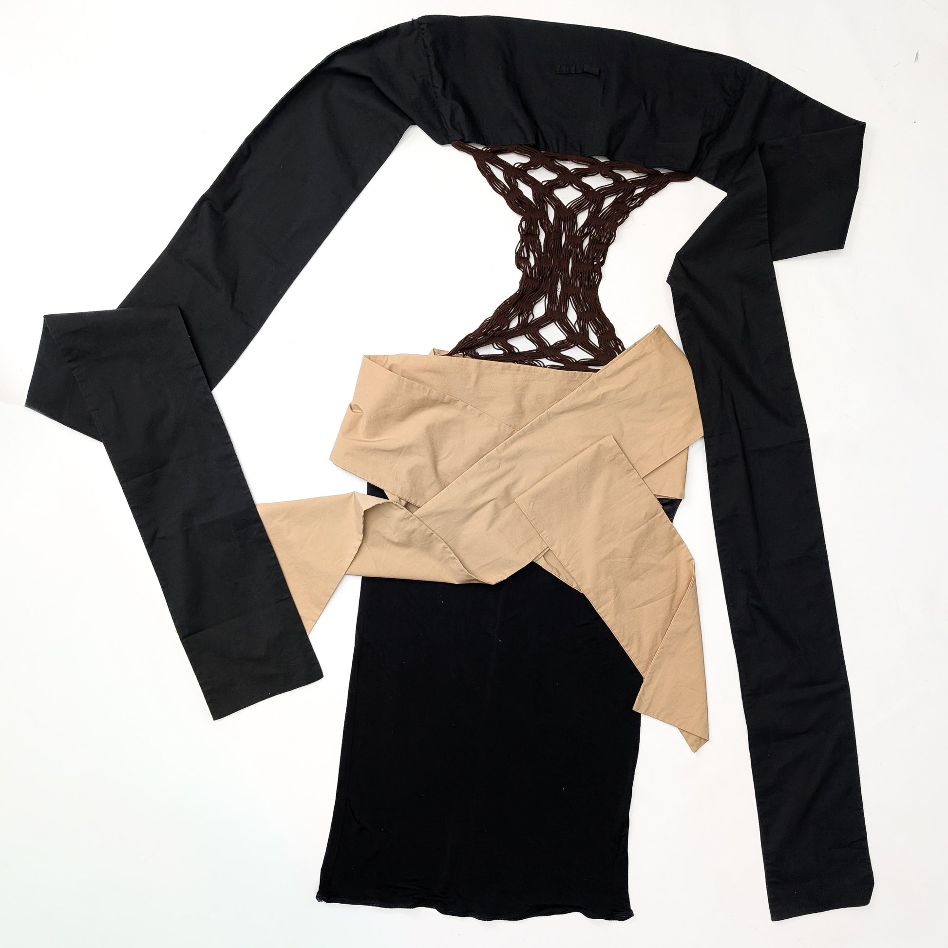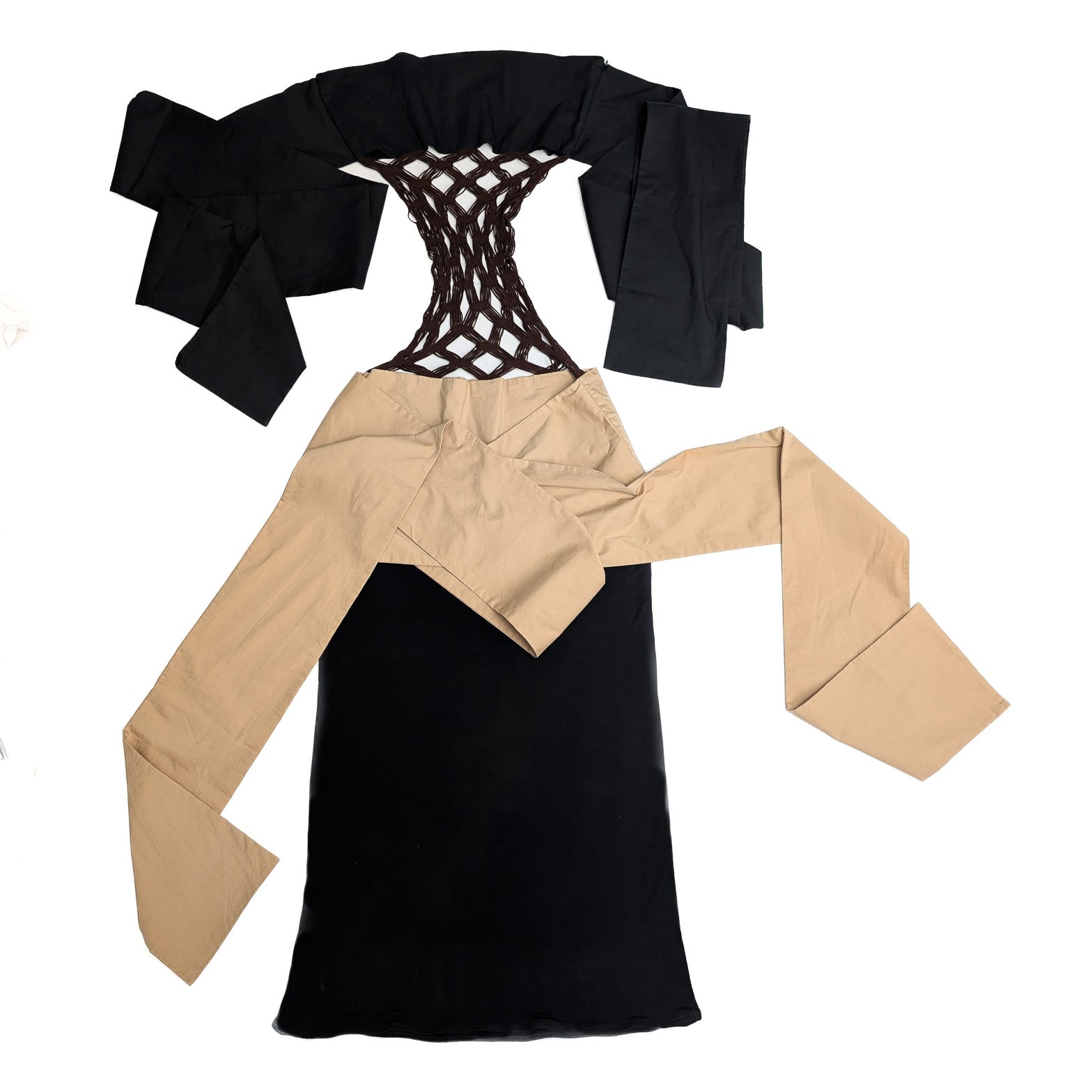 Item: Robe bicolore noire et beige ornée d'empiècements en resille. Peut se porter de différentes façon. Les gros rubans peuvent se nouer à l'arrière, ou à l'avent, croisés ou en formant un nœud.