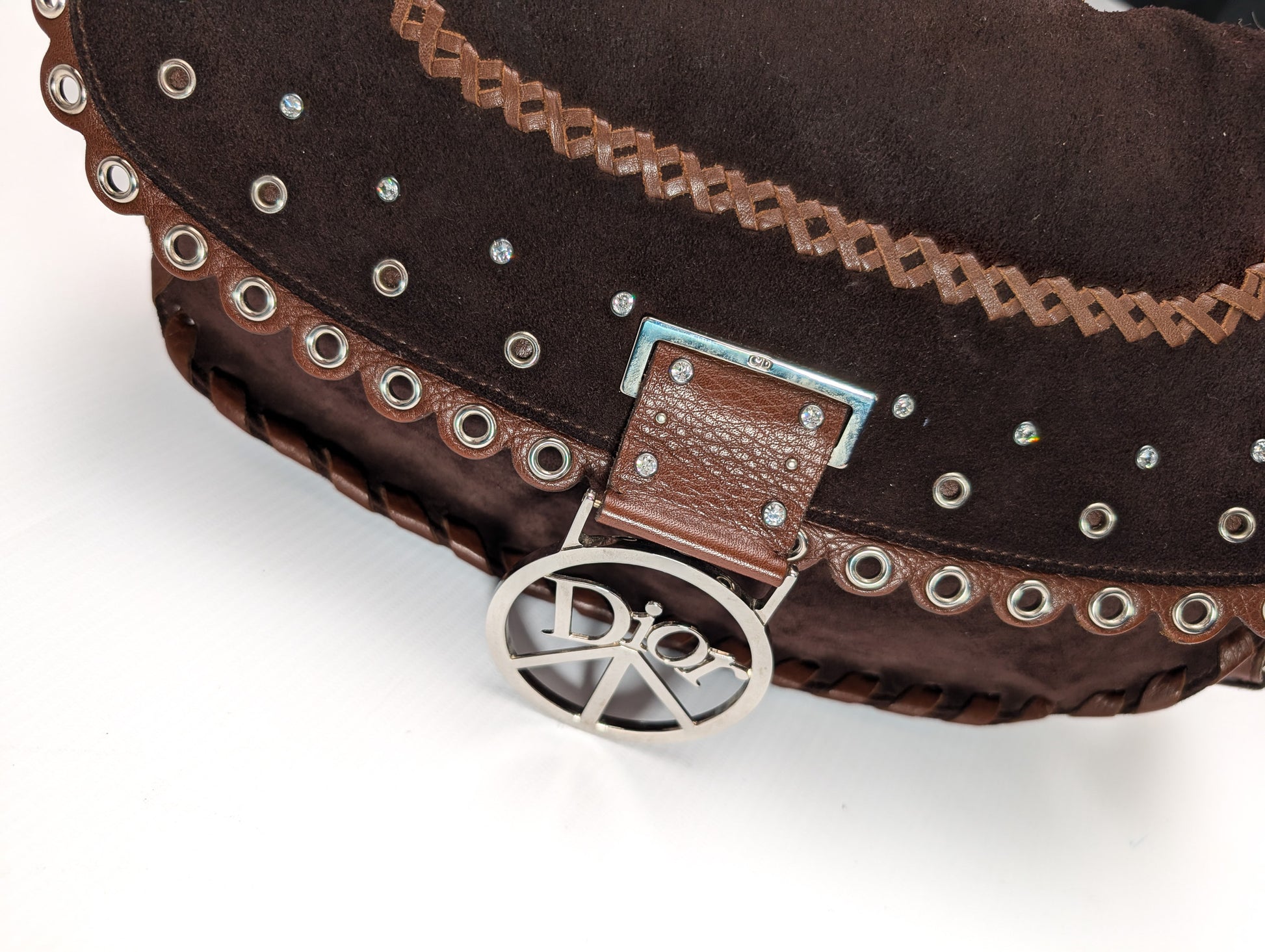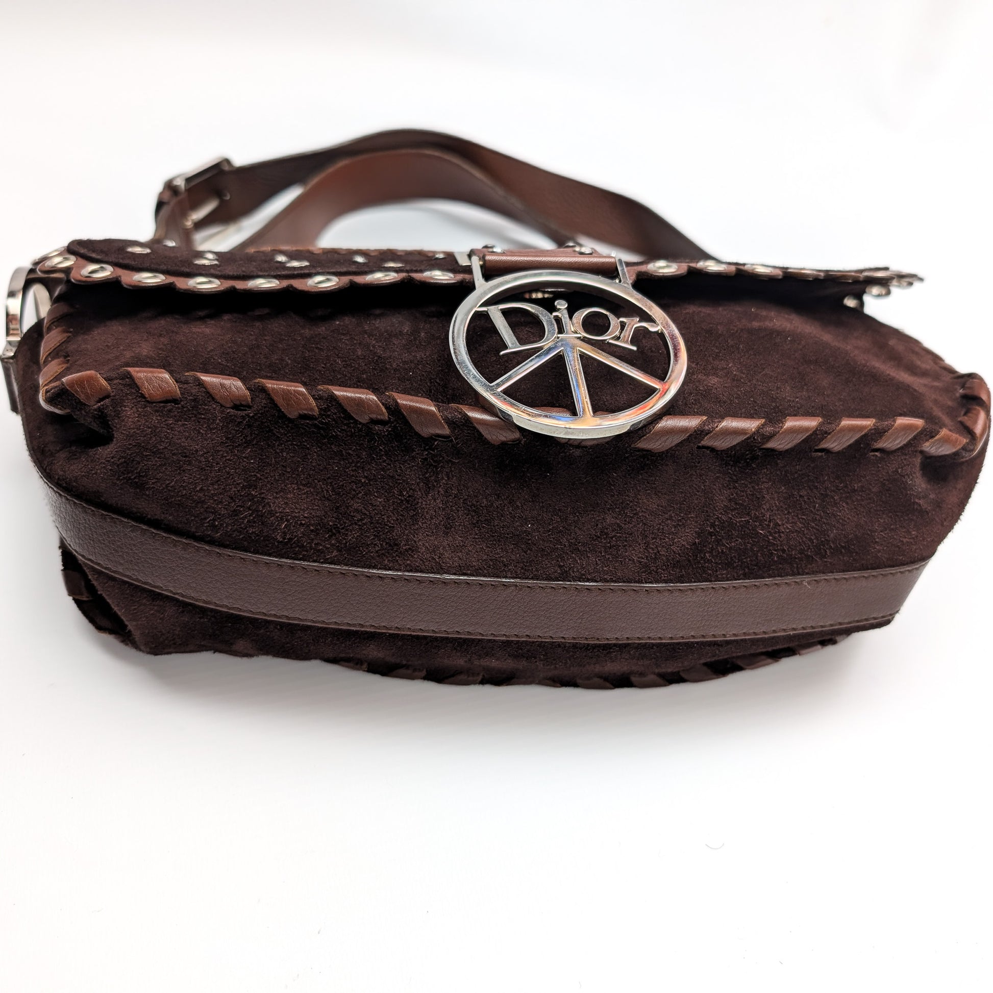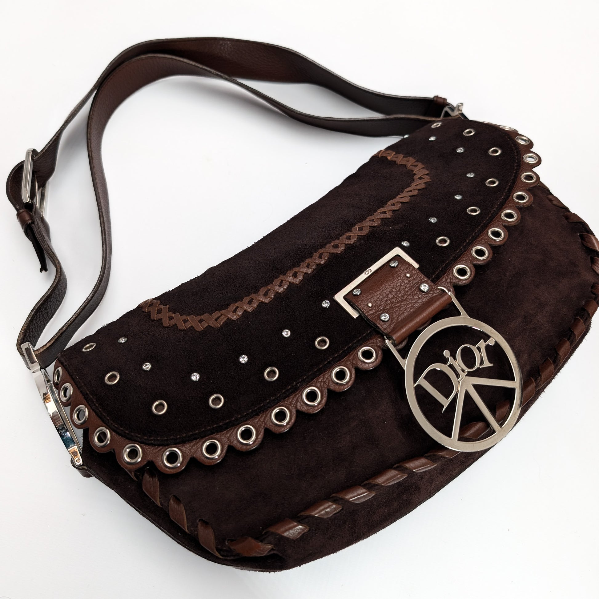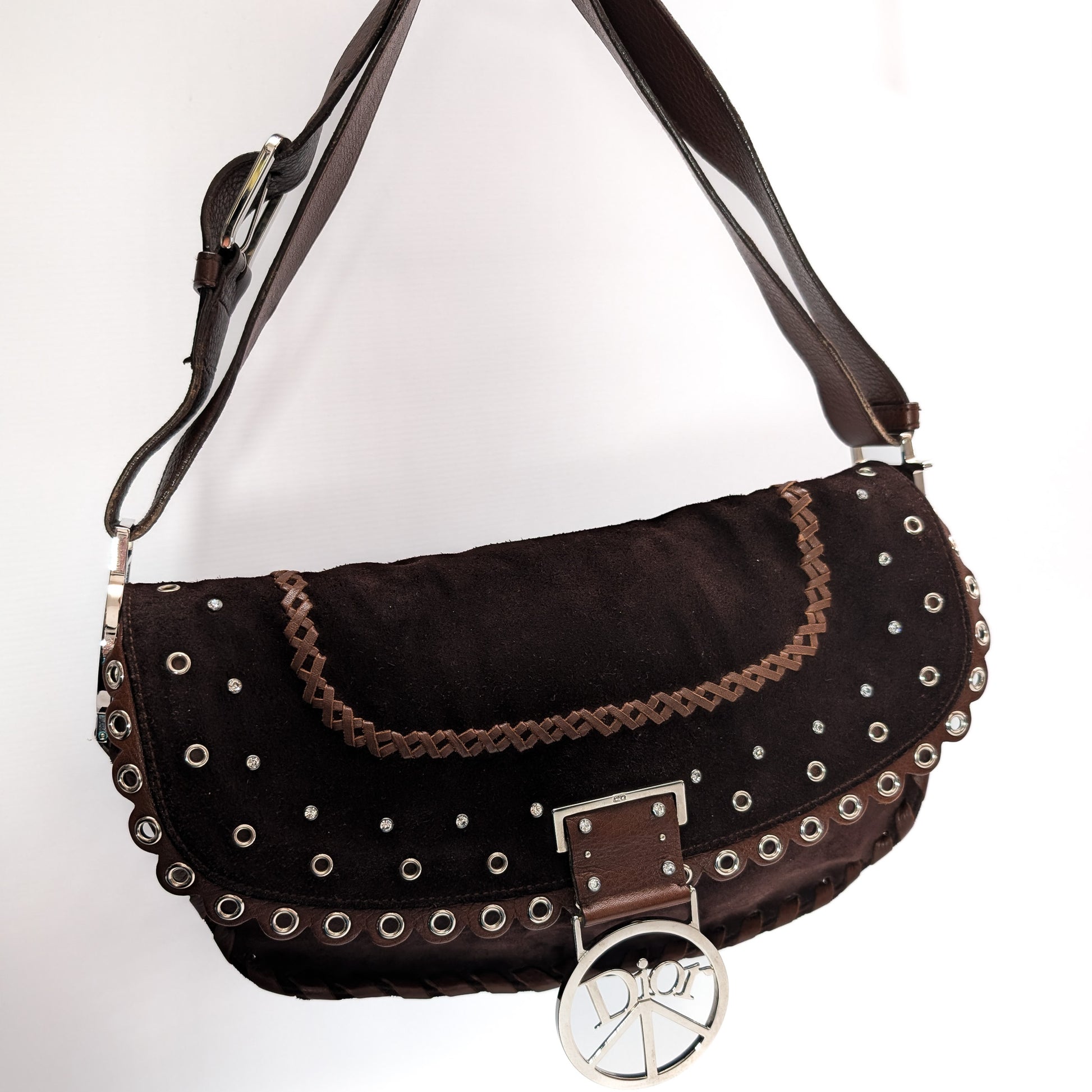 Item: Christian Dior Peace and Love brown suede handbag or shoulder bag embellished with crystals, crystal studs, eyelets and silver-tone hardware.