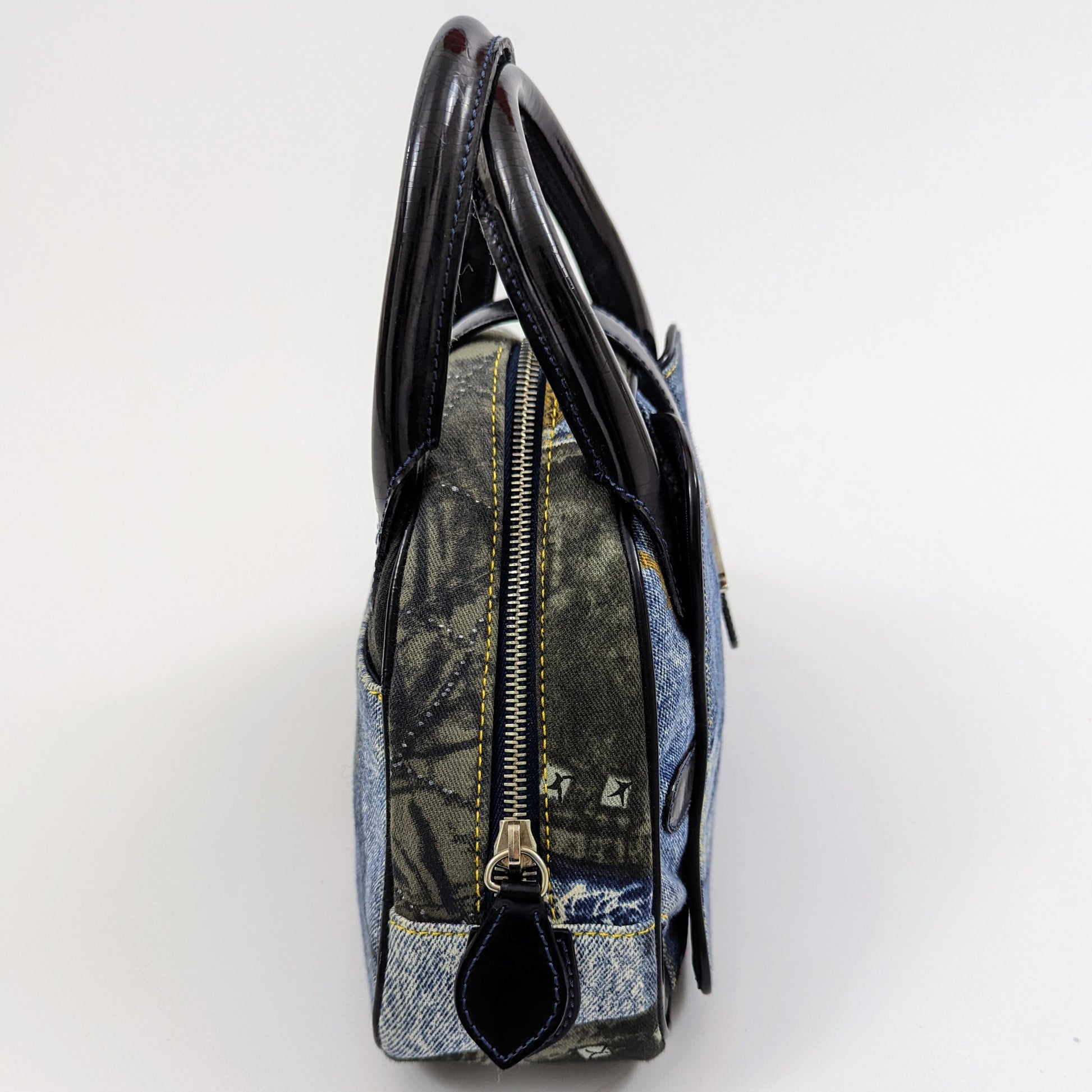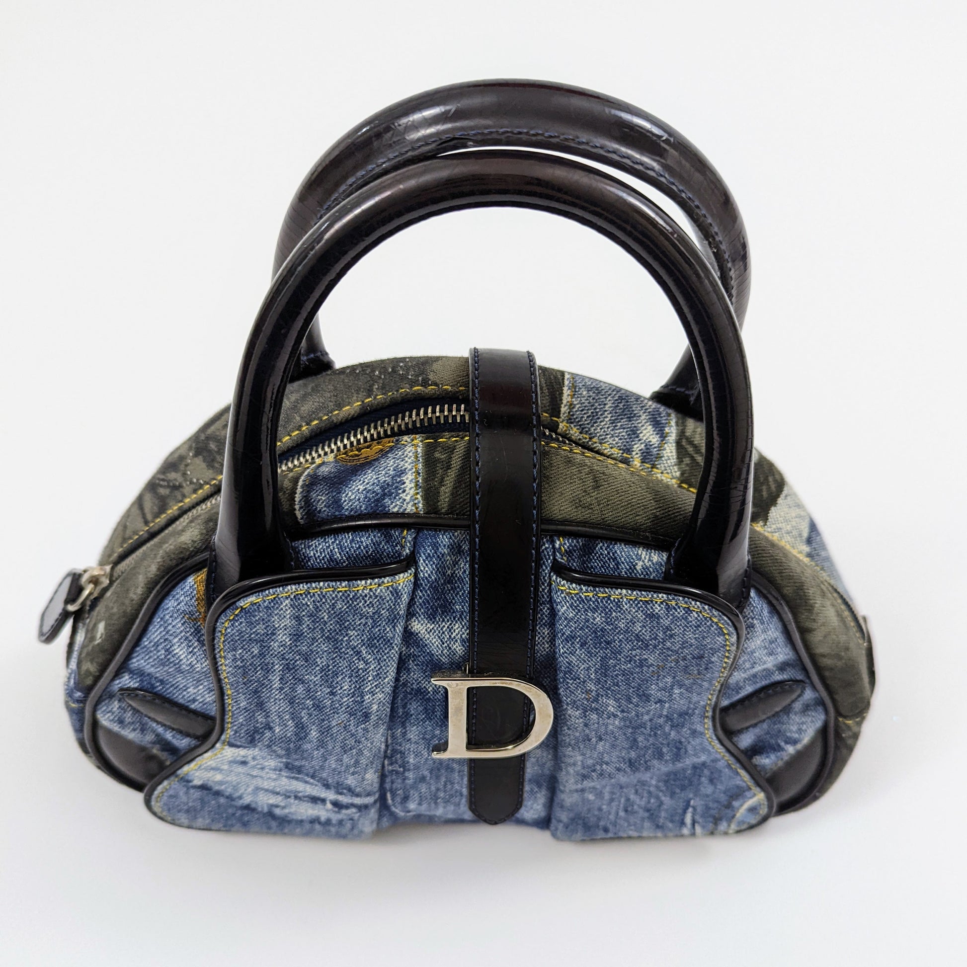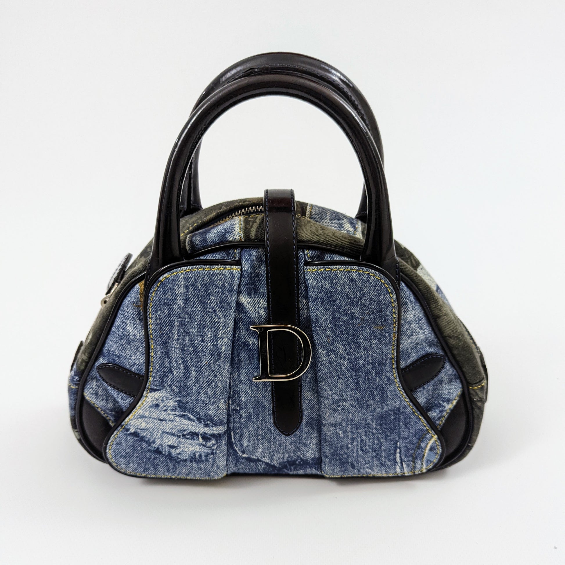 Item: Sac mini Saddle Bowler Denim Dior par Galliano. Motif trompe l'œil en denim. Ornement argenté. Poche extérieure et intérieur. Poigné en cuir. Fermeture zippée en haut.